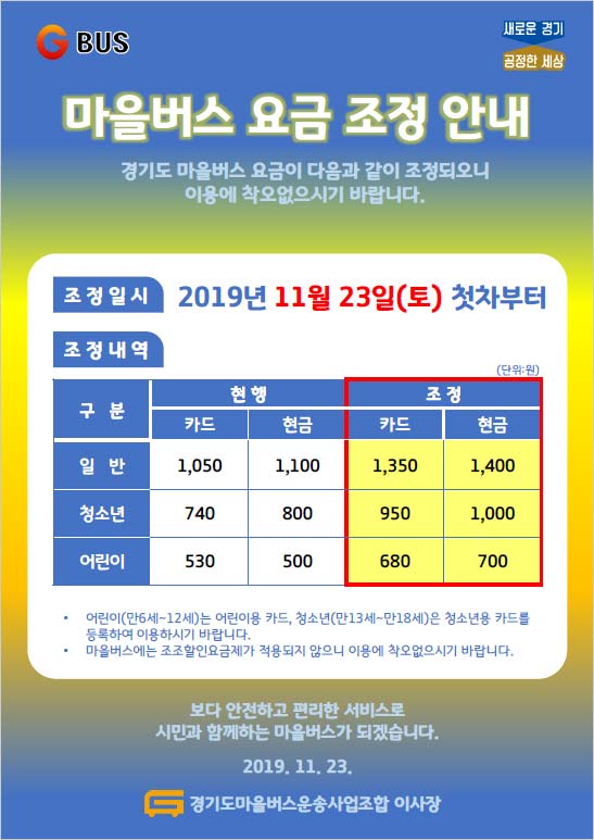 경기도 마을 버스는 11월 23일 첫 차부터 성인 현금 기준 1100~1200원 하던 요금이 1300~1400원으로 오릅니다. 시·군마다 조금씩 요금이 달라서 확인이 필요합니다. 성남시는 시내/시외 구간이 달랐던 요금이 1400원으로 통일된다고 합니다.